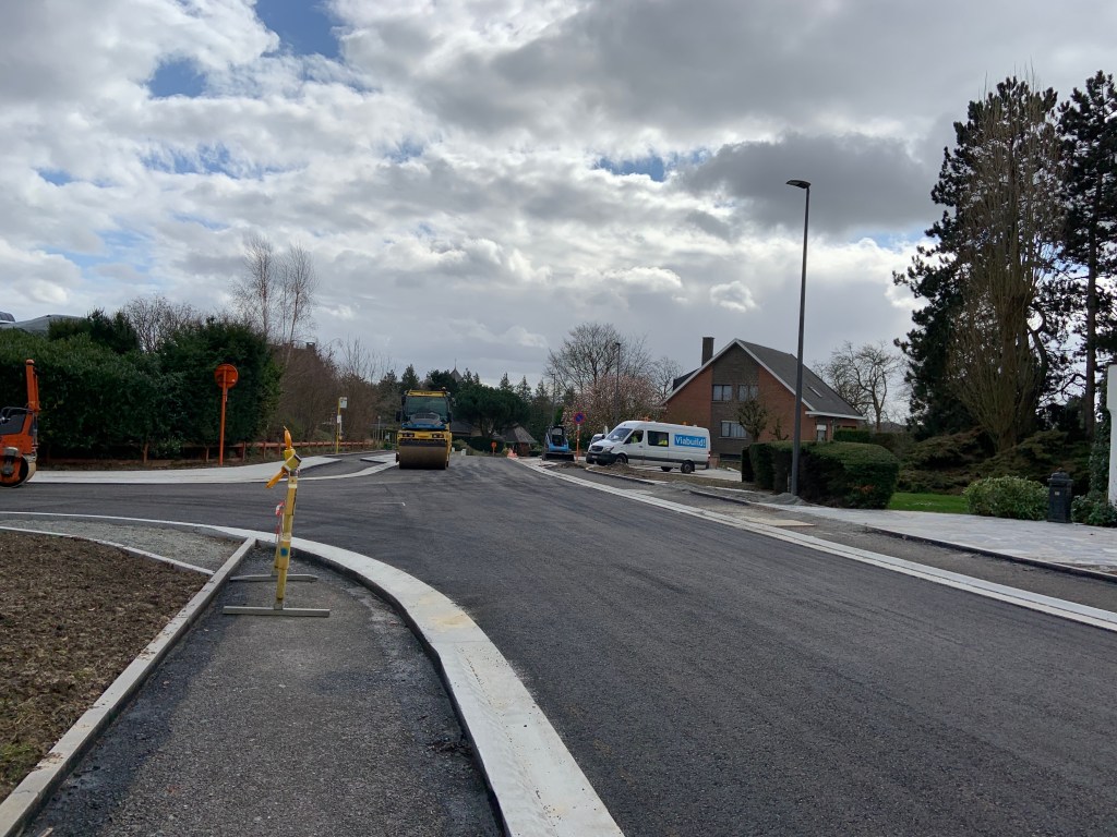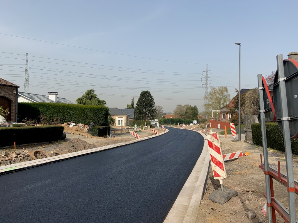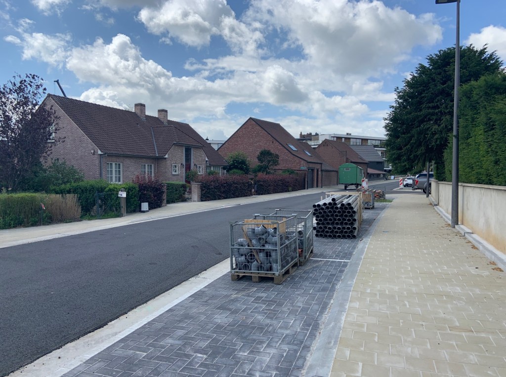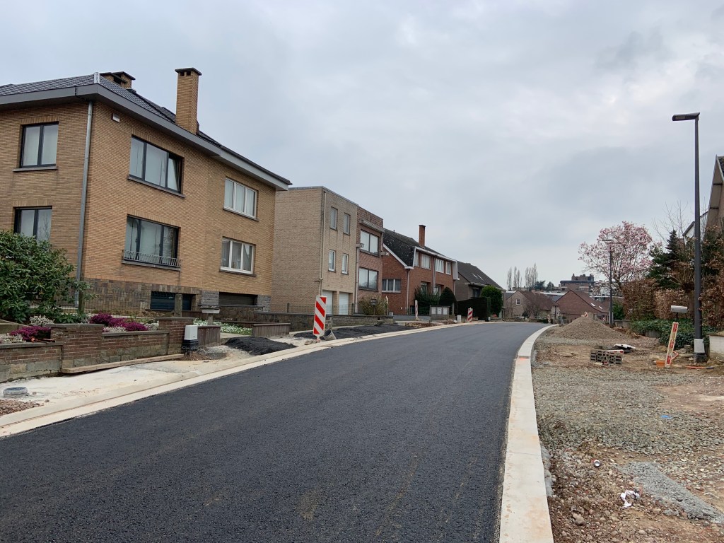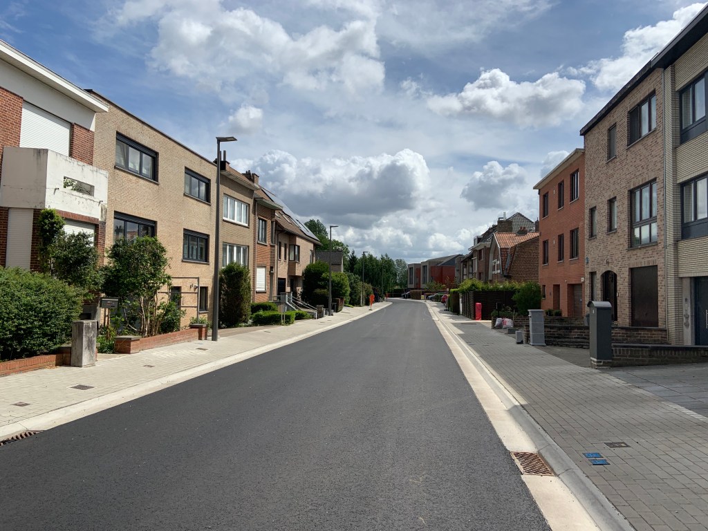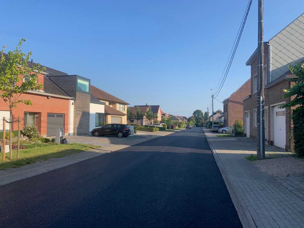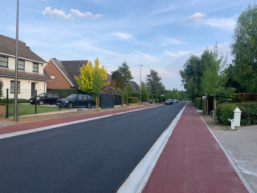 De Ternatstraat in Bodegem werd volledig vernieuwd: nieuwe stevige fundering, nieuwe rioleringen, 3 lagen asfalt, fietspaden, verhoogde busperrons,…