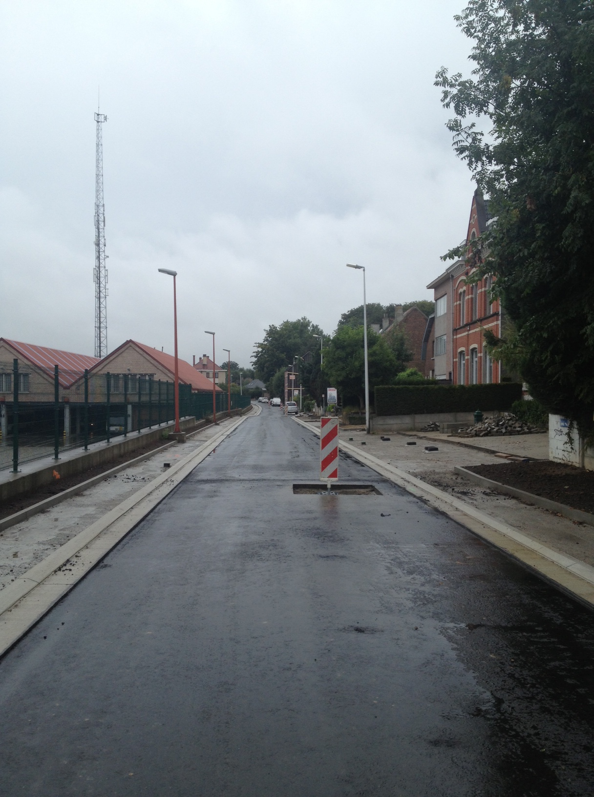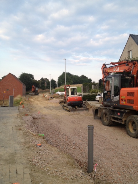 Het eerste deel van de N8 tot de d’Arconatistraat heeft al een asfaltlaag. Nu de voetpaden…