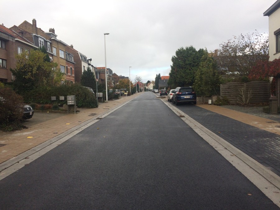 Afgewerkte Moeremanslaan met breed voetpad links en afgebakend parkeren rechts