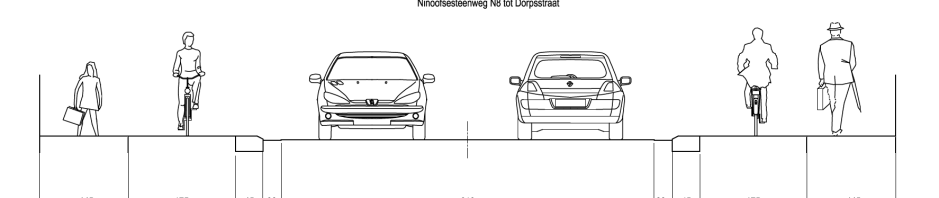 In de tweede zone tussen de Dorpsstraat en de Neerhofstraat is een parkeerstrook van 2m noodzakelijk. Hiervoor wordt op alles wat beknibbeld: rijweg van 5,8m, fietspaden van 1,5m en voetpaden van minimum 1m.